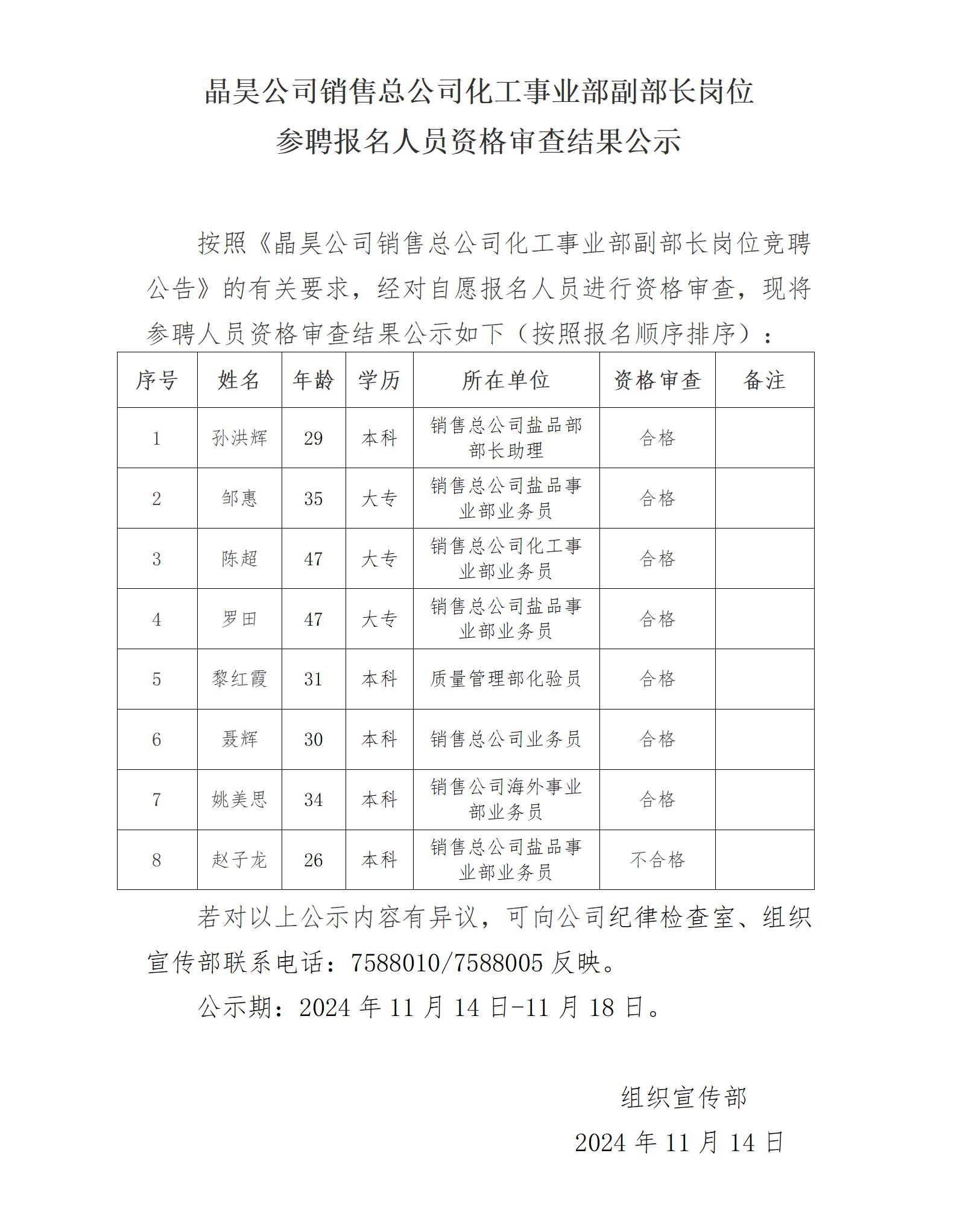 zzxzls公司销售总公司化工事业部副部长岗位参聘报名人员资格审查结果公示