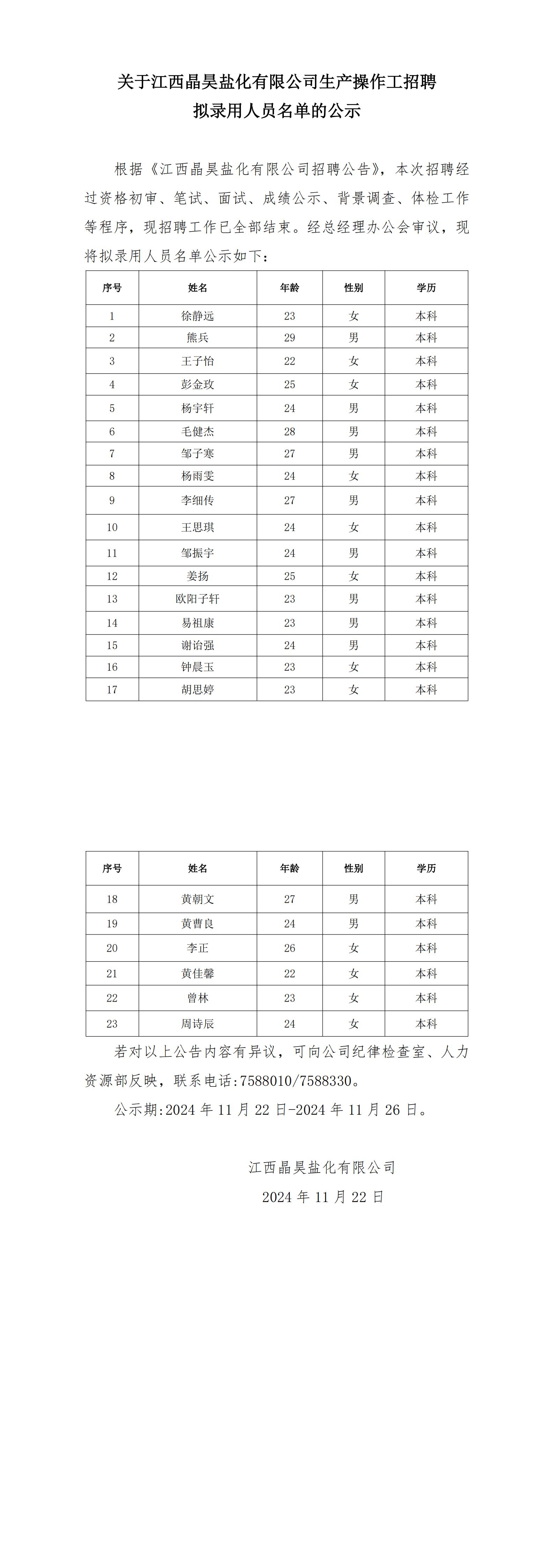 关于新利18官网生产操作工招聘拟录用人员名单的公示